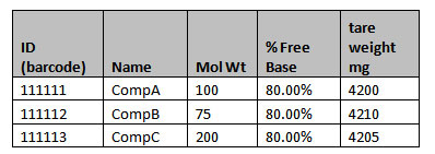 After the taring has been performed on a batch of vials, the associated data is stored in a table for easy future access. This table can be recalled by the Zinsser software to be used in future operations such as the weighing step, and can also be exported by the Zinsser software and subsequently imported into the customers compound management database system. Below is a typical example of a table of tare weight data. In this case, the system has already been provided with a reference table to start with that includes the barcode ID, the compound name, the molecular weight of the compound, and the percent free base of the compound. The taring system fills in the tare weight column after filling the vials.