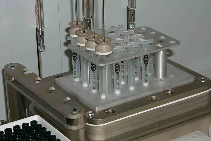Closeup of SPE cartridges mounted on block, using gas probes for monitored positive pressurization. Vacuum and/or positive pressure can be used.